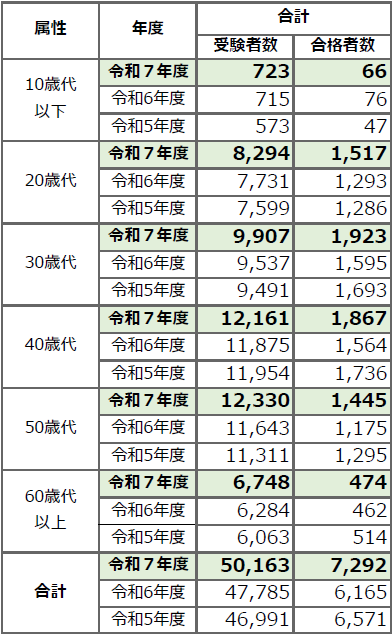 年代別に見ると、20〜30代の合格率が高く、50〜60代の合格率が低いことがわかります。